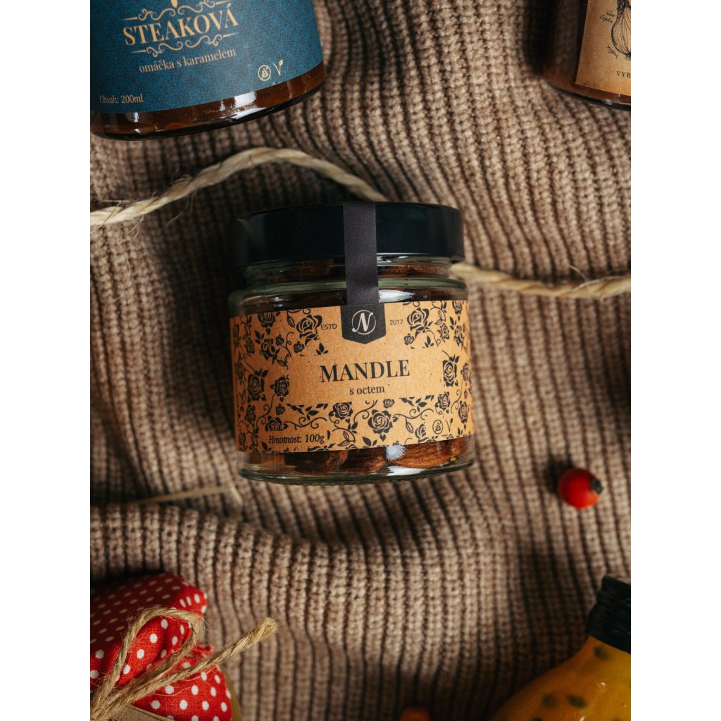 - 100 g Mandle s octem: Křupavé mandle marinované v kvalitním octu, skvělá svačinka nebo příloha k vínu.