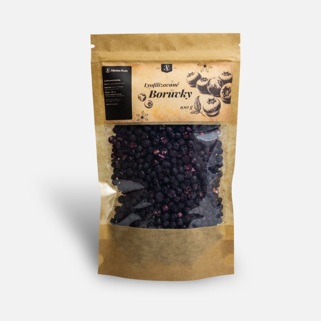 Lyofilizované Borůvky Lyofilizované borůvky jsou drobné křupavé kuličky 100 % ovoce sušené mrazem (lyofilizace), které si zachovávají intenzivní lesní chuť a aroma. Bez přidaného cukru a aditiv, vhodné jako rychlá svačina i do pečení.
