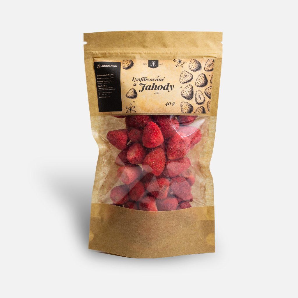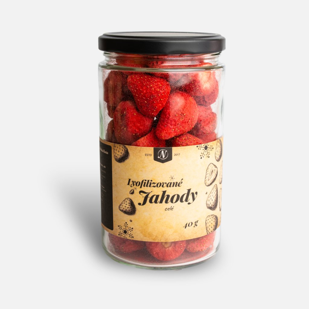 Lyofilizované Jahody – Celé lyofilizované jahody nabídnou efektní vzhled a výraznou jahodovou chuť. Jsou to 100 % jahody sušené mrazem (lyofilizace), které si zachovávají aroma a barvu. Bez přidaného cukru a aditiv, skvělé na zdobení i mlsání. SPoužití: