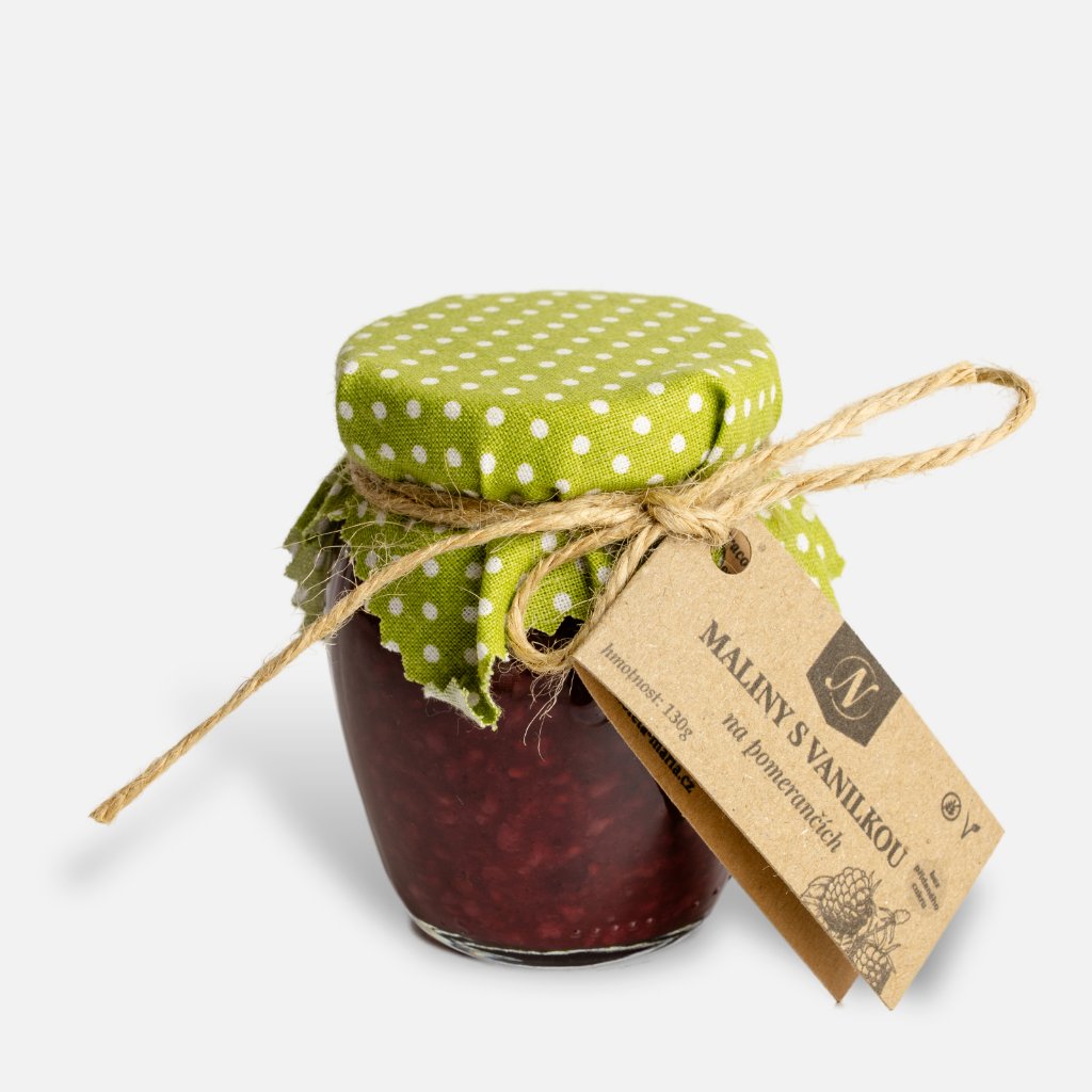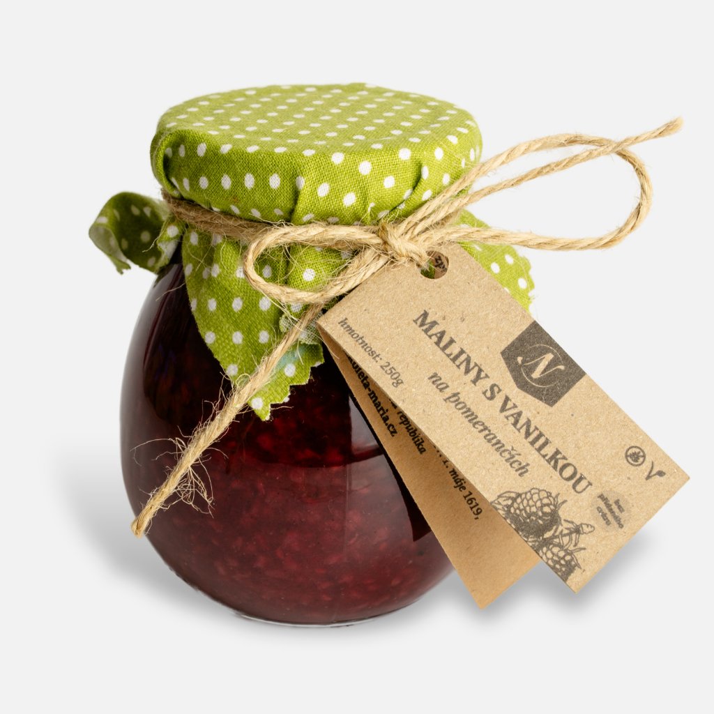 Maliny na pomerančích – Marmoleta bez přidaného cukru, spojení malin a svěží pomerančové šťávy s jemným nádechem vanilky. Ideální k dezertům či pečivu.